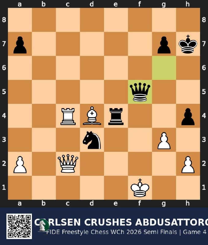 ! Магнус разгромил Абдусатторова 3-1 в полуфинале (2 ничьи + 2 победы). В решающей 4-й партии Карлсен играл чёрными — и это было больно для Нодирбека. 📍 Вайссенхаус, Германия | Рапид 25+10 | Chess960 Всего 29 ходов. Дебют в шахматах Фишера — каждая партия с чистого листа, без домашних заготовок. Карлсен планомерно захватил центр (d5+e5+c5), а Абдусатторов неудачно гамбитировал пешку на 12-м ходу. Кульминация — серия зевков: • 23.Фb3?? — ферзь покинул защиту короля (надо было Фd1) • Карлсен тоже промахнулся: 24...Кc5?? вместо выигрывающего Сd4+ • 26.Лc4?? — второй грубый зевок (надо было Лb1) • 29.g3?? — мат неизбежен! 29...Фf5+ — и Абдусатторов сдался. Мат в 3 хода. В финале Карлсена ждёт Каруана. Это будет огонь 🔥 🔗 Разбор с аннотациями: https://lichess.org/study/K3IGgk2c/IuxbigPy