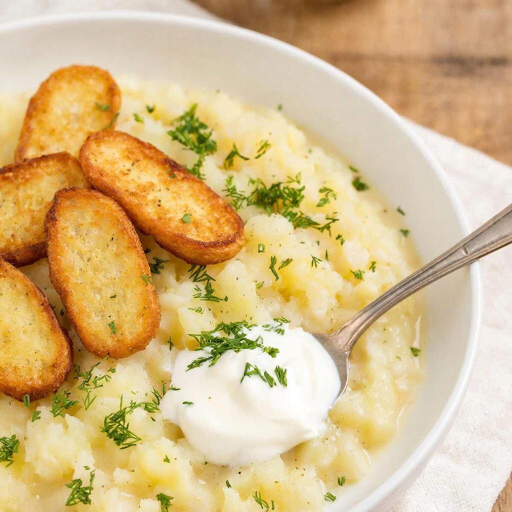 Разложите готовую картофельную кашу по тарелкам и украсьте сверху хрустящими гренками и укропом, добавьте сметану.