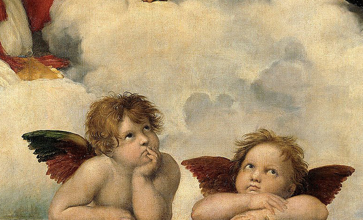 Для начала давайте разберемся в количестве ангелов. На картине можно увидеть двух ясно изображенных ангелов. Их называют путти или путто. На итальянском это слово означает "малыш". Путти Рафаэля стали самыми известными. Через образ путти в искусстве Возрождения любили изображать херувимов, хотя в Библии херувимы не описаны как малыши. Подробнее об ангелах Библии я публиковал серию статей, ссылки будут в конце.