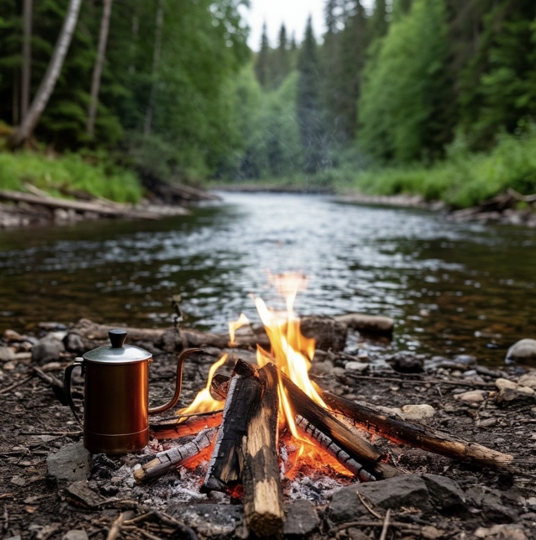 Немного погревшись у костра, найдя в лагерных пожитках чайник, наполнив его чистой родниковой водой, купленной в магазине, я начал копаться в гермофлягах в поисках кофейной банки.