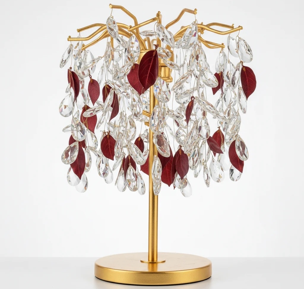 Она стояла на углу письменного стола, чуть в стороне от стопок книг и разбросанных ручек, и была самым неуместно-прекрасным предметом в этой комнате. Её тонкий ствол, искусно выкованный из золота, тянулся вверх, переплетаясь в изящную крону. Ветви бережно удерживали гроздья прозрачного хрусталя, который, даже когда лампа была выключена, ловил скупые лучи солнца и рассыпал вокруг крошечные радуги.