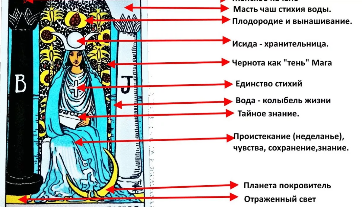 Карта Верховной Жрицы в колоде Уэйта — настоящая сокровищница символизма. Она кардинально отличается от своих предшественниц и хранит множество секретов, зашифрованных художницей Памелой Колман Смит под руководством мистика Артура Уэйта. Вот самые интересные факты об этом аркане. Возможно, вы знаете, что в старых колодах, например, Марсельском Таро, эта карта называлась Папессой (La Papesse) и изображалась в папской тиаре . Это отсылало к легенде о Папессе Иоанне — женщине, которая якобы взошла на Святой престол . Однако Артур Уэйт, создавая свою колоду, решил уйти от христианских образов и наполнить карту более универсальным, эзотерическим смыслом. Так Папесса превратилась в Верховную Жрицу — хранительницу тайных знаний, связанную с такими древними богинями, как Исида, Астарта и Шехина (в иудейской мистике — женственное проявление Бога) . Каждая деталь на этой карте имеет глубокий смысл. Давайте разберем самые интересные из них. Верховная Жрица — антипод Мага. Если Маг — это активное