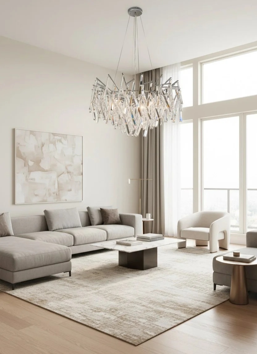 Глядя на эти острые, чистые лучи, невольно ловишь себя на мысли: веками расти, чтобы однажды взлететь под потолок и осветить собой чью-то обычную, но такую прекрасную жизнь. И в этом свете всё становится немного честнее, что ли. Чётче. Как алмаз, который точит стекло, «Кристалл» точит пространство, обрезая всё лишнее, оставляя только красоту.