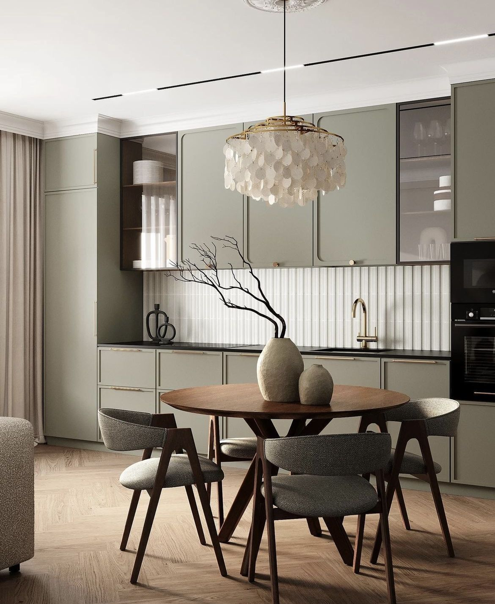 - Комбинированная кухня — часть стены — шкафы в потолок, часть — открытые полки или без верхних шкафов. Баланс хранения и лёгкости.