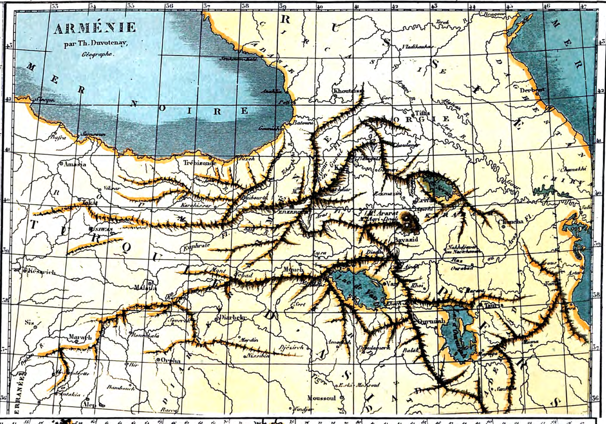 В конце XIX века в Париже, на улице Сен-Жак, находилась типография «Мезон Бассе». К концу века она уже теряла свои позиции — эпоха ручной гравюры заканчивалась. Но в 1875–1879 годах там выпустили большой энциклопедический атлас «Дополнение к современной энциклопедии». В нём было несколько сотен карт, в том числе карта Армении. Её автором был французский картограф Тюно Дювотне. О Дювотне известно немного. Он родился в 1796 году и прожил семьдесят девять лет. Его профессия была тихой и незаметной, он не открывал новых земель и не возглавлял экспедиций. Он гравировал карты на медных досках — это была кропотливая работа, требовавшая твёрдой руки и хорошего зрения. Дювотне работал в команде с другими французскими картографами своего времени — Барбье дю Бокажем, Вюйменом, Шарлем, Левассёром, Дюфуром. Все они делали карты для одних и тех же парижских издательств. Карты были небольшие, складные, предназначенные для массового читателя: их покупали школы, чиновники, торговцы и прочие. Карты Дюво