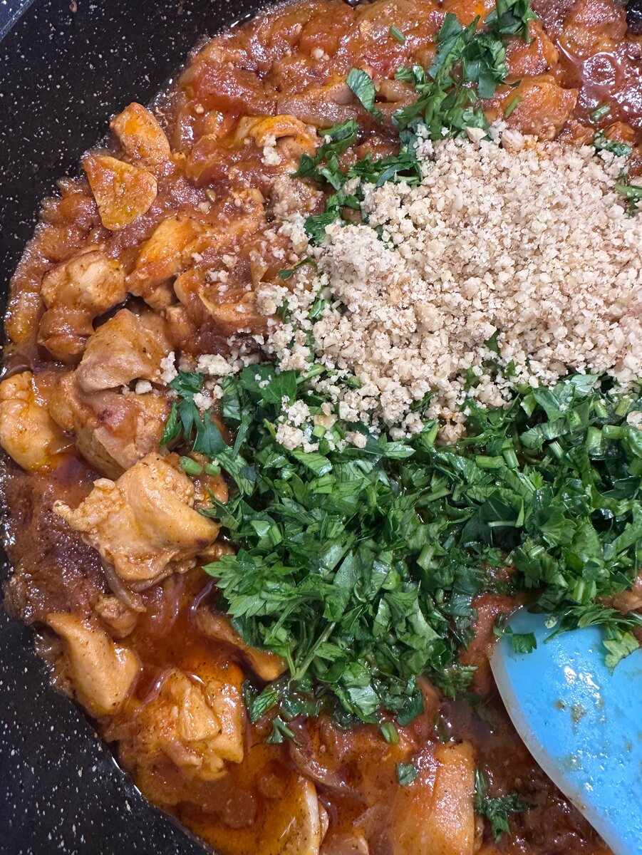 🐔🍅 Перепробовала несколько рецептов, прежде чем вывела тот, который меня устроит. Итак, нам понадобится: 💫Филе куриного бедра (500-700гр) 💫Лук 2-3 штуки 💫Чеснок зубчиков 5 💫Столовая ложка сливочного масла 💫Столовая ложка томатной пасты 💫Хмели-Сунели 💫Помидоры штук 4-5 💫Кинза 💫Петрушка 💫Грецкий орех Приготовление: ▶️Куру выложить на разогретую сковородку с растительным маслом обжариваться. Я выбрала вариант филе и режу на небольшие кусочки - так удобно подавать ребёнку. ▶️ Когда обжарится с одной стороны, перевернуть и выложить сверху лук, нарезанный перьями или полукольцами. Не мешать, просто закрыть крышкой. ▶️Перемешать уже когда кура обжарится со второй стороны. ▶️Как только лук тоже обжарится до золотистой корочки - добавить чеснок. ▶️Когда лук и чеснок обжарились - добавляем ложку сливочного масла и через минутку ложку томатной пасты. ▶️ Томатную пасту хорошо перемешиваем и обжариваем с курой, луком и чесноком. ▶️ Потом добавляем нарезанные томаты (предварительно