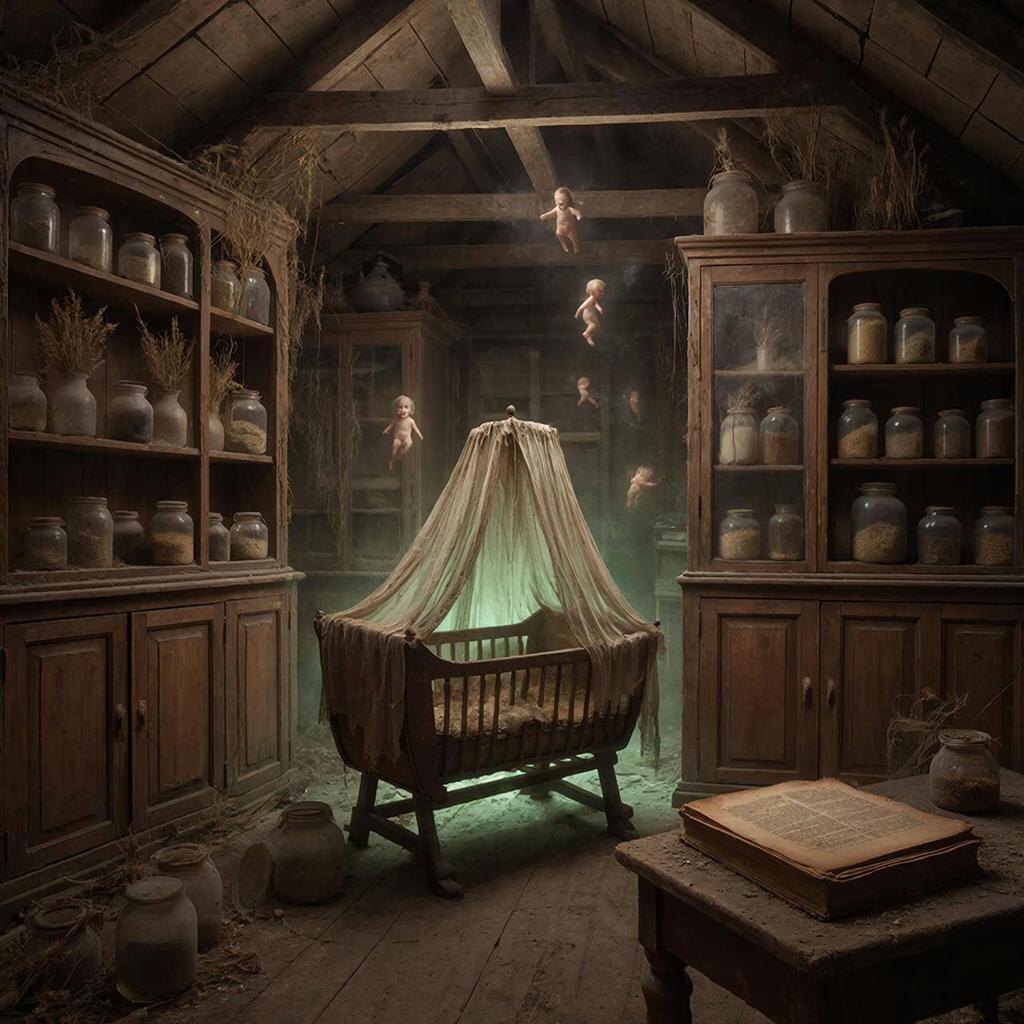 Егор подошёл ближе. В одной из банок, заполненной мутной жидкостью, плавало нечто, напоминающее… пуповину. В другой, сухой, лежали засохшие, сморщенные предметы, похожие на детские пальчики, но Егор отогнал эту мысль как бредовую. В третьей, завёрнутые в холстину, покоились чьи-то зубы. Молочные, детские, с неровными краями.