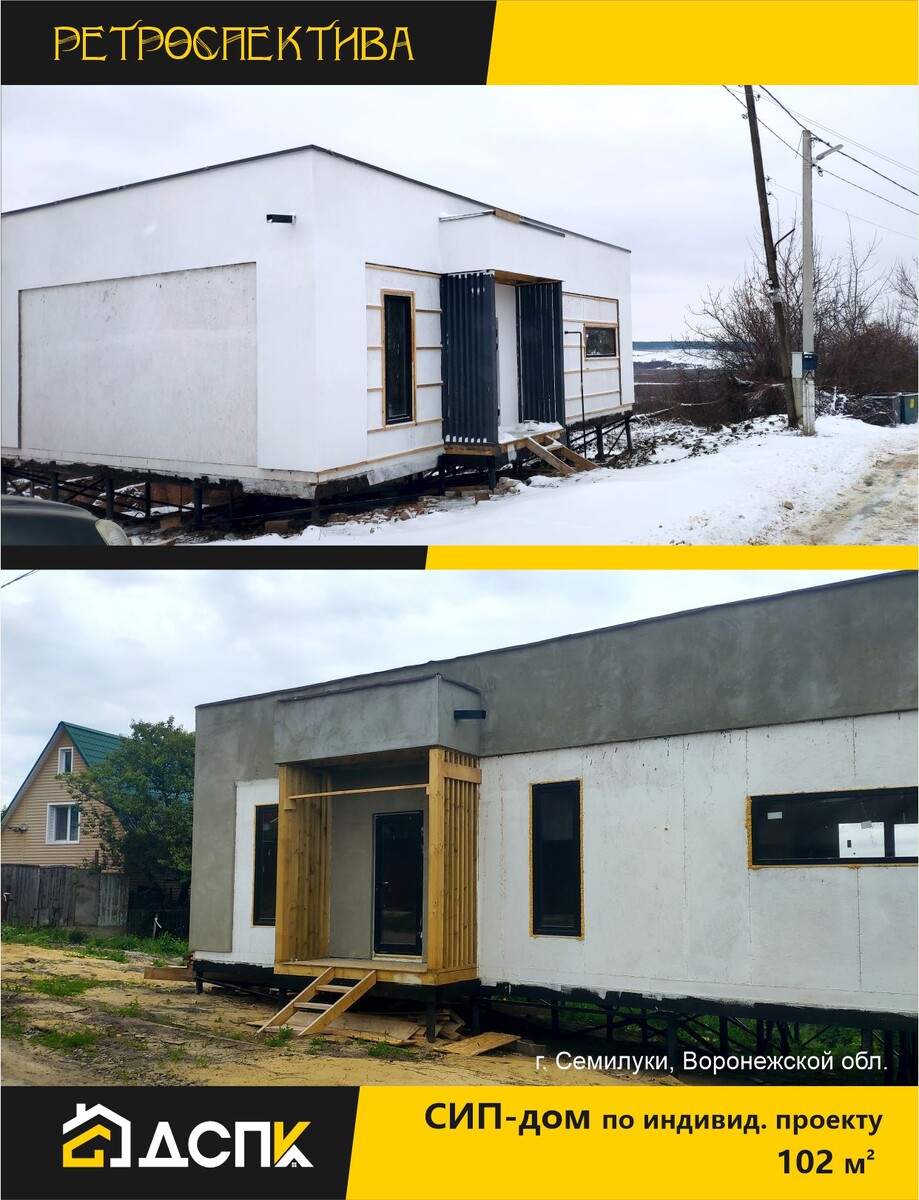 А вы любите пересматривать фото, сделанные год назад? 📸У нас это профессиональное и зимне-сезонное. Ведь именно в январе выдается свободное время, чтобы подвести итоги строительного года. Предлагаем присоединиться! В рубрике «Ретроспектива» расскажем о наиболее интересных объектах команды «ДСПК». Начнём с проекта СИП-дома с плоской крышей в г. Семилуки Воронежской области. Несмотря на преимущества такого вида кровли, большинство всё ещё выбирают классические варианты крыши. Однако наш взгляд, дом получился современным и по-европейски стильным. Ещё одной особенностью строительства дома был сложный рельеф участка, на котором велось строительство. Но для свайно-винтового фундамента это не проблема, ведь его можно устанавливать на самом сложном наклонном рельефе, когда одна сторона дома практически «висит» в воздухе. На низких участках сваи выступают из земли выше, чем на высоких, таким образом верхняя часть свай будет располагаться в горизонтальной плоскости. Дом из СИП панелей по индиви