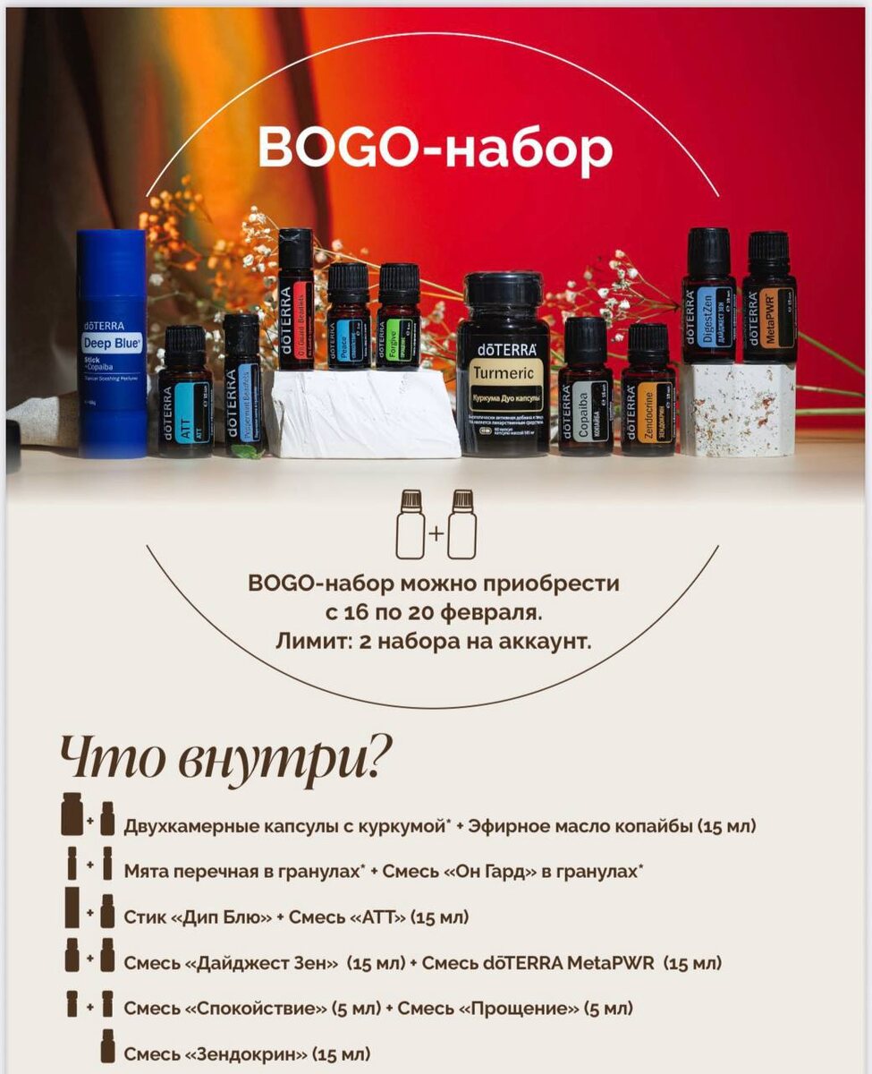 Завтра стартует любимая акция BOGO 🤩 При покупке эфирного масла второе идет в подарок! Как всегда есть набор - 11 продуктов по цене 5 🔥 🔥 🔥 По заказу пишите мне в лс @anutka_andrevna Парочки улетают всегда быстро 💨
