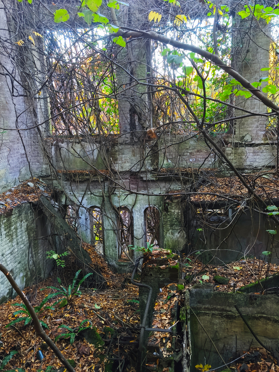Ну, вернее - по тому, что от них ещё осталось Растительность сильнее Ну, и бамбук тут же Здание на склоне, мы поднимаемся всё выше. Крыша фасада сейчас почти вровень с нами Но мы поднимаемся всё выше А ступени-то противоскользящие! И природой невозможно не восторгаться! Ну, вот и остовы самых высоких крыши этого корпуса на нашем уровне.. Воздух! Тут реально другой воздух, возможно, из-за эвкалиптов А теперь мы подошли ко второму корпусу санатория Смецкого.