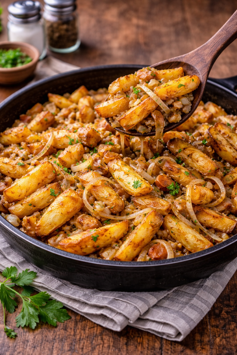 Иногда никакие запеканки и сложные сочетания не нужны. Хочется самой обычной жареной картошки с луком. Чтобы с румяной корочкой, ароматом на всю кухню и хрустящими краешками. Я люблю такие простые блюда. Без изысков, без дорогих ингредиентов — просто нормально поесть. И да, я немного ленив, поэтому готовлю так, чтобы минимум лишних движений. Этот рецепт — мой базовый вариант. Получается всегда, если соблюдать пару простых правил. На 2–3 порции хватает спокойно. Что понадобится: Картофель — 1–1,2 кг (80–130 рублей)