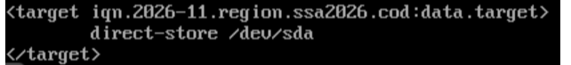- Настроить отдачу нашего диска по iSCSI отредактировав конфигурационный файл /etc/tgt/targets.conf:добавив в конец файла следующее содержимое