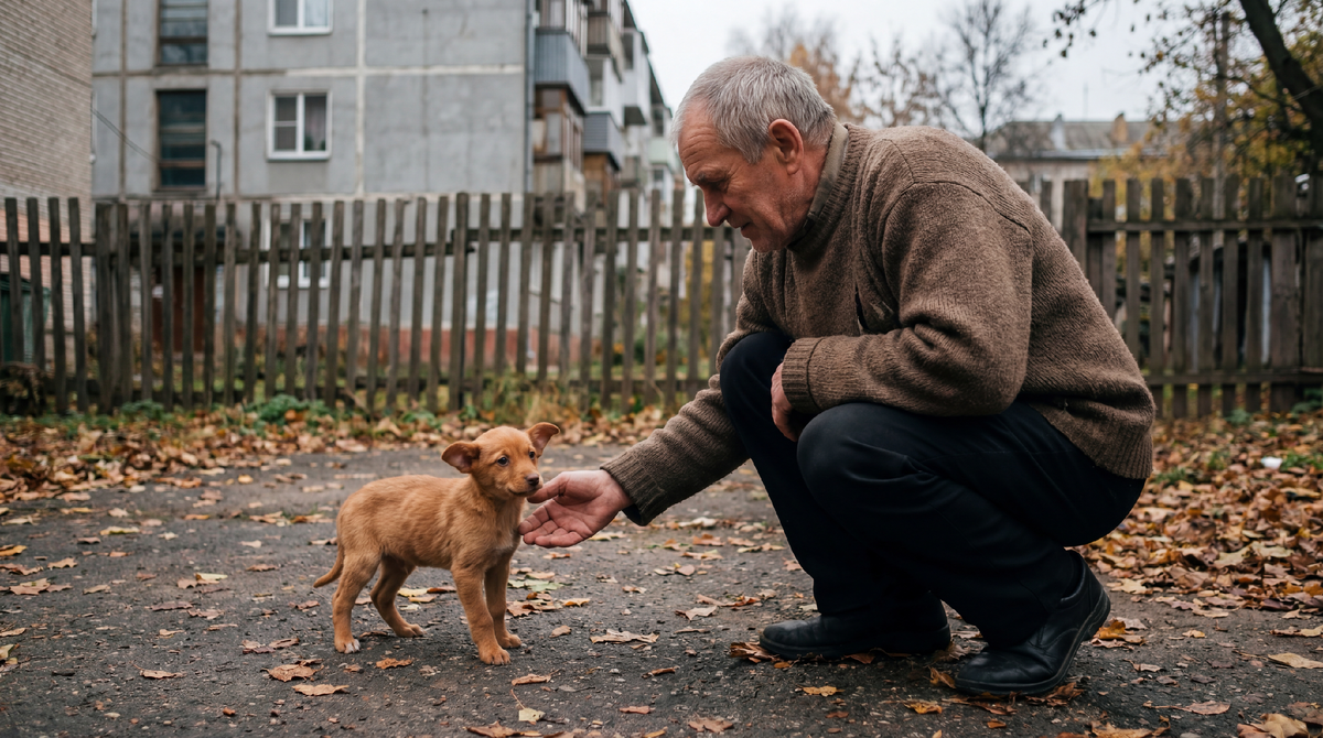 Спустился вниз, натянув куртку на ходу. Щенок всё так же сидел у забора. Я присел рядом на корточки, колени хрустнули. Он подполз ближе, осторожно, будто боялся что я ударю. Ткнулся холодным носом в мою ладонь.