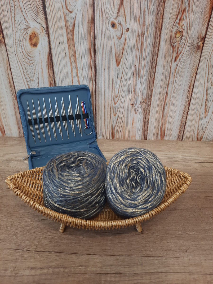 Пряжа довольно скользкая. Поняла, что лучше использовать деревянные спицы и спицы с тупыми кончиками, поскольку острая спица периодически попадает в плетённый шнурок - можно вытянуть нить и сделать затяжку.