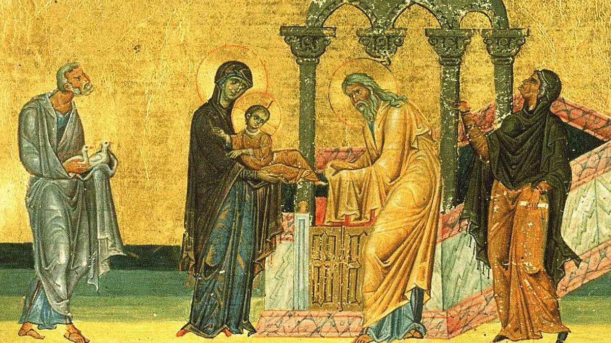 «В лице Симеона весь Ветхий Завет, неискупленное человечество, с миром отходит в вечность, уступая место христианству…» — писал епископ Феофан Затворник. На иконе Сретения Господня праведный