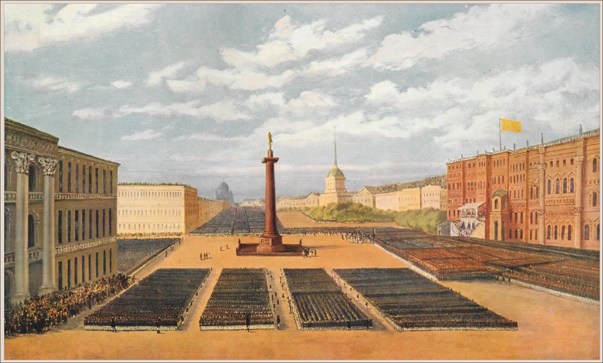 После того как император в сопровождении великого князя Михаила, принца Вильгельма Прусского и фельдмаршалов Витгенштейна и Паскевича осмотрел войска, он вернулся в центр площади и подошёл к колонне. С балкона дворца духовенство начало петь Te Deum. Армия и народ внимательно слушали. Но как описать последовавший момент? Воцарилась глубочайшая тишина; лишь издалека можно было услышать церковное пение и голос архидиакона, читавшего в память об Александре молитву за усопших. Я видел, как император Николай, присутствовавший на службе, теперь вышедший из дворца, на глазах у всего собравшегося народа внезапно опустился на колени, и как 100 000 солдат в стремительном движении сделали то же самое.