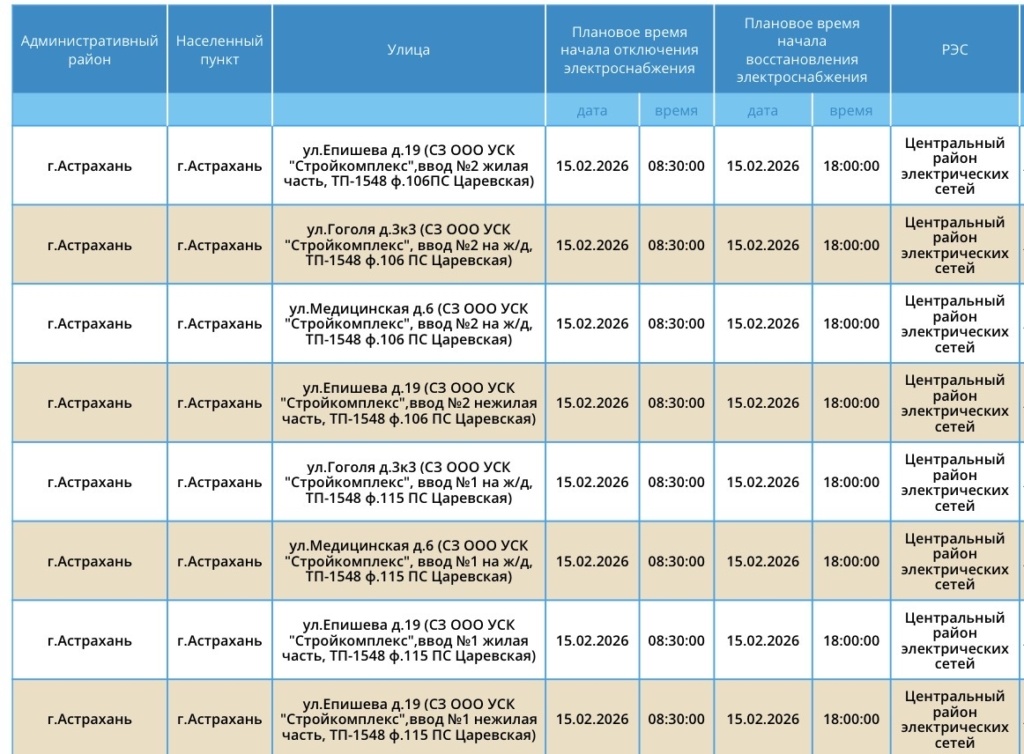 15 февраля некоторые астраханцы останутся без света почти на 10 часов