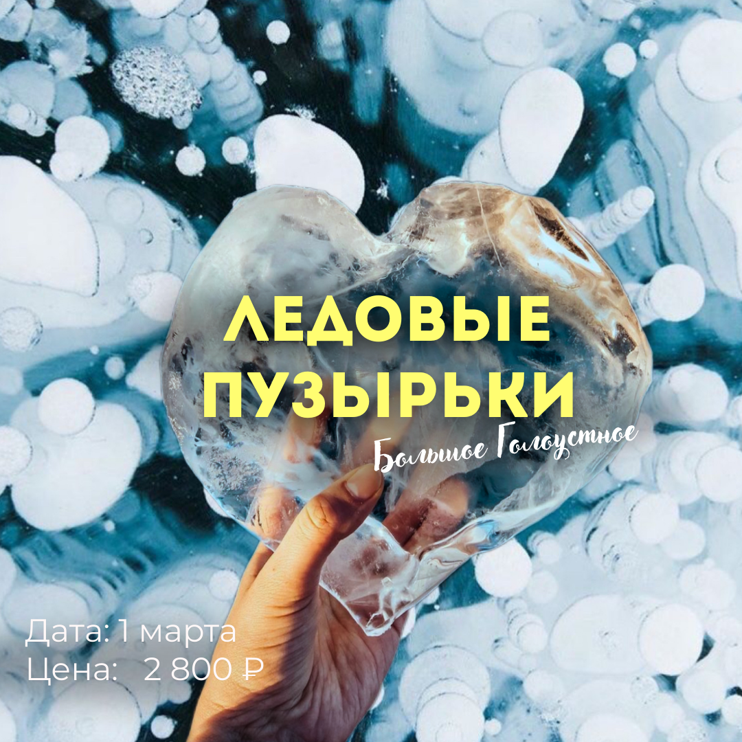 Представьте: вы стоите на льду Байкала, а под ногами — замёрзшие пузырьки метана, поднимающиеся со дна. Они застыли в толще прозрачного льда, образуя причудливые узоры, за которыми охотятся фотографы со всего мира. В марте это природное явление особенно эффектно. Приглашаем вас в однодневное путешествие в Большое Голоустное, чтобы увидеть байкальские пузырьки, подышать хрустальным воздухом и прокатиться на финских санях вдоль берега священного озера. В воскресенье 1 марта 2026 года мы отправляемся в путешествие. Выезд из Ангарска в 9:00. По пути сделаем санитарную остановку и заедем в кафе «7 тополей», где можно будет перекусить (средний чек — около 500 рублей). Обед за ваш счёт, но голодными не останетесь. К 12:00 мы будем на месте. Вас ждёт трассовая экскурсия по пути следования — гид расскажет об истории этих мест, о Байкале и особенностях зимнего Голоустного. Главная часть программы — пешая прогулка к Сухому озеру и фотосессия на фоне знаменитых метановых пузырьков. Лёд в марте уже
