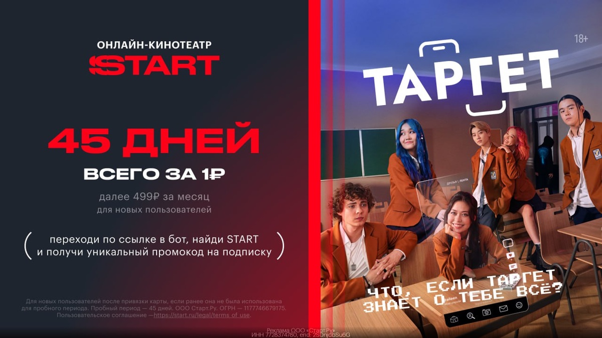 ) Переходи в чат-бот (https://t.me/xalava2024free_bot) 2) Забирай уникальный промокод 3) Применяй его на сайте или в мобильном приложении (https://start.ru/code?erid=2SDnjdbSu6G) И смотри культовые фильмы и сериалы 45 дней всего за рубль. Акция для новых пользователей, далее 499 р/мес