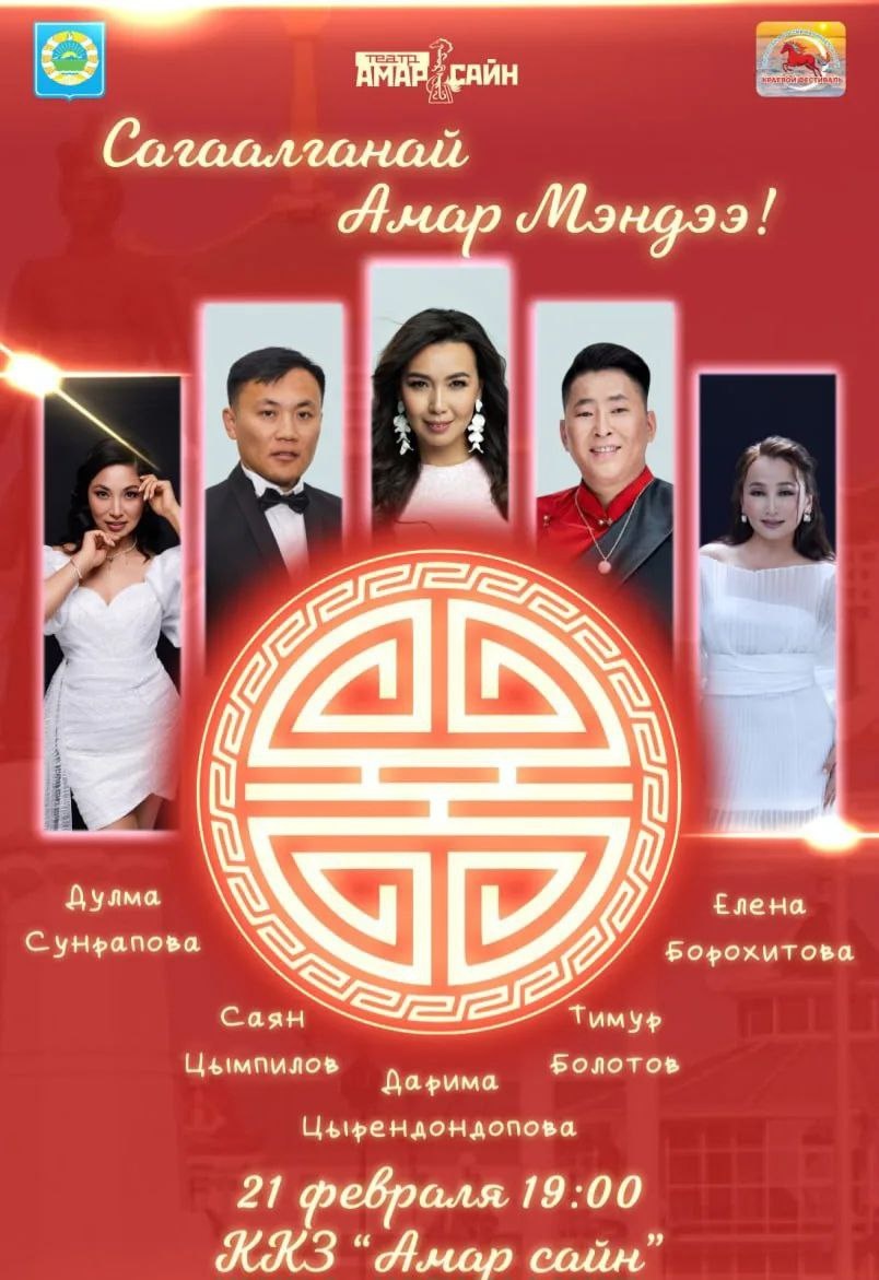 Краевой фестиваль «Сагаалган в России начинается с Аги» завершится праздничным концертом с участием звезд бурятской эстрады. 🎤 Тимур Болотов 🌟 Дулма Сунрапова 💃 Дарима Цырендондопова ✨ Елена Борохитова 🔥 Саян Цымпилов 21 февраля в 19:00 часов вечера ждем всех в киноконцертном зале «Амар сайн». Вечер подарит яркие эмоции, зарядит позитивом и станет прекрасным финалом насыщенных праздничных мероприятий Сагаалгана в Агинском округе.