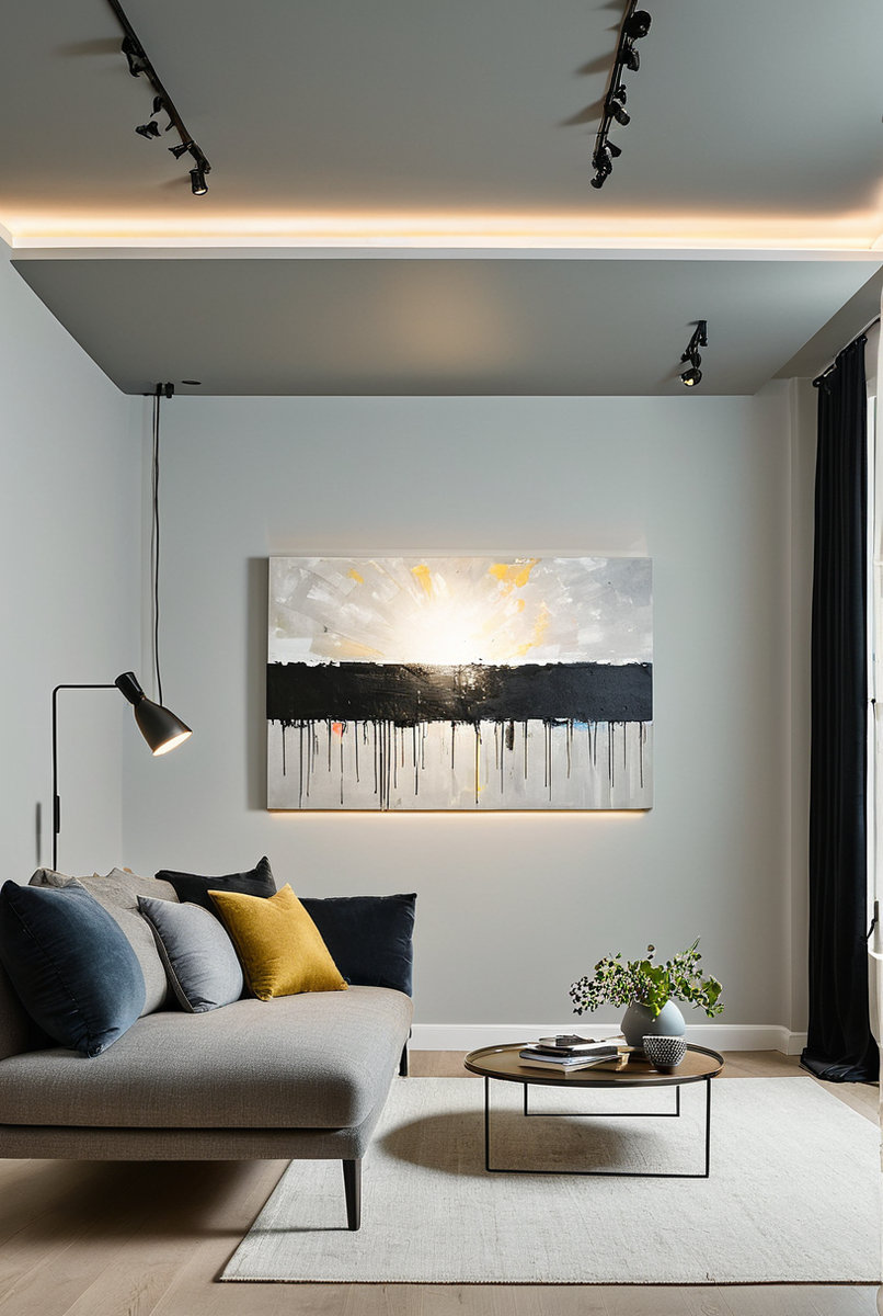 Для гибкого зонирования трековая система на шинопроводе идеальна. Поворотный светильник легко перемещать‚ меняя акцентное освещение в интерьере большой гостиной. Статичная спот-система (одиночный или двойной спот) подходит для зон‚ где локальное освещение не меняется‚ например‚ в коридоре.