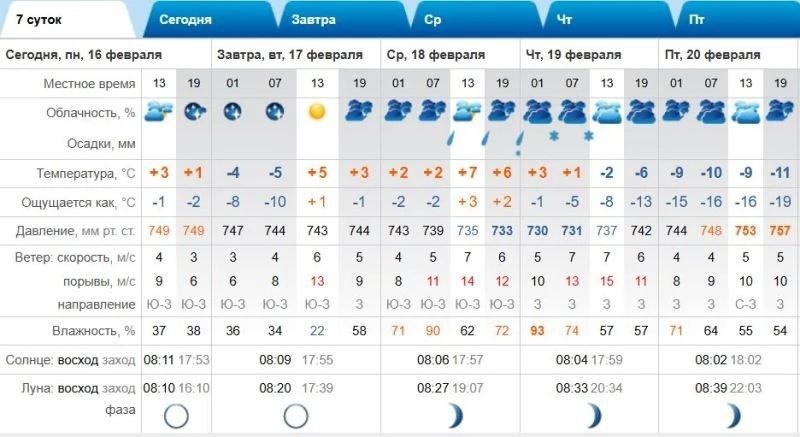 Сегодня днём +3, значительная облачность, осадков синоптики rp.5 не прогнозируют, ветер юго-западный 4-9 м/с. Во вторник ещё теплее: ночью -4, днём +5, небо станет ясным, по-прежнему без осадков, ветер того же направления, его порывы усилятся до 13 м/с. Среда станет самым жарким днём "пятидневки" - ночью не ниже +2, днём воздух прогреется до +7, значительная облачность, днём и вечером небольшой дождь, ветер неизменно юго-западного направления и 7-14 м/с. В четверг тепло начнёт отступать: ночная температура воздуха составит +3, днём похолодает до -2 (по ощущениям -8), пасмурно и небольшой снег, ветер западный до 15 м/с. В пятницу и ночью, и днём -9, ощущаться будет -16, пасмурно, без осадков, ветер северо-западный 5-10 м/с. 🇷🇺 Запад24 в MAX ™️Запад 24 в ВК 🌐Наш сайт