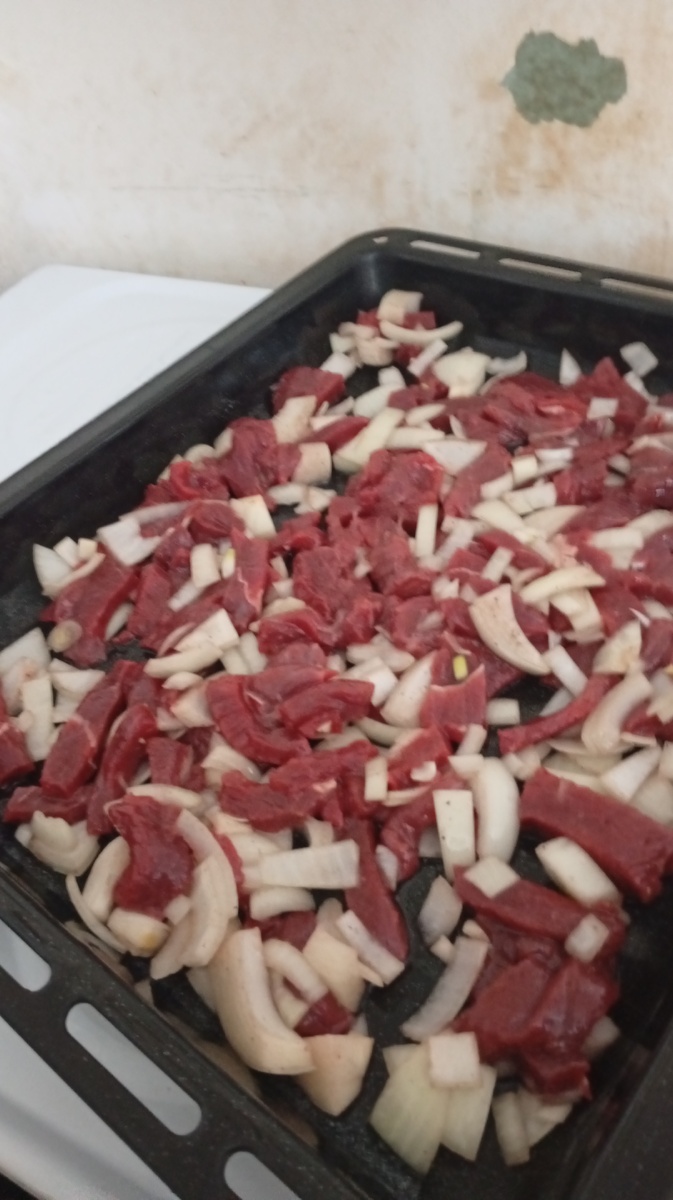 Разморозила кусок говядины на 600гр. Нарезала с луком , посолила - поперчила, полила растительным маслом и в духовку.