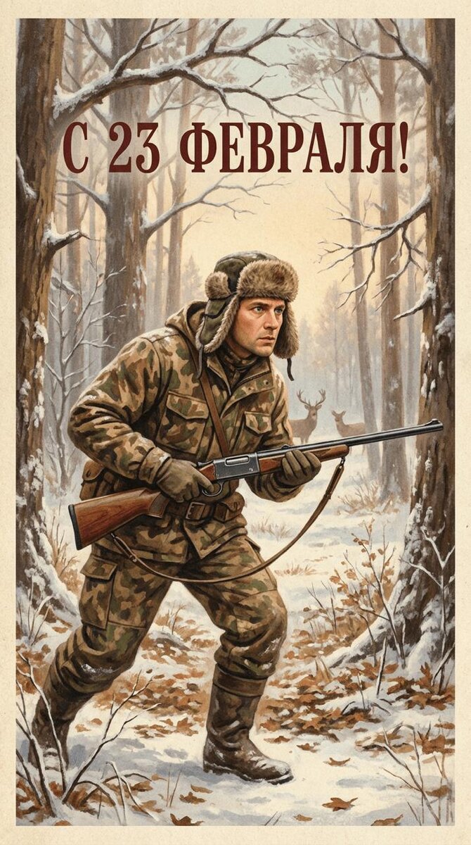 Промт открытка на 23 февраля через ИИ с мужчиной охотником в зимнем лесу