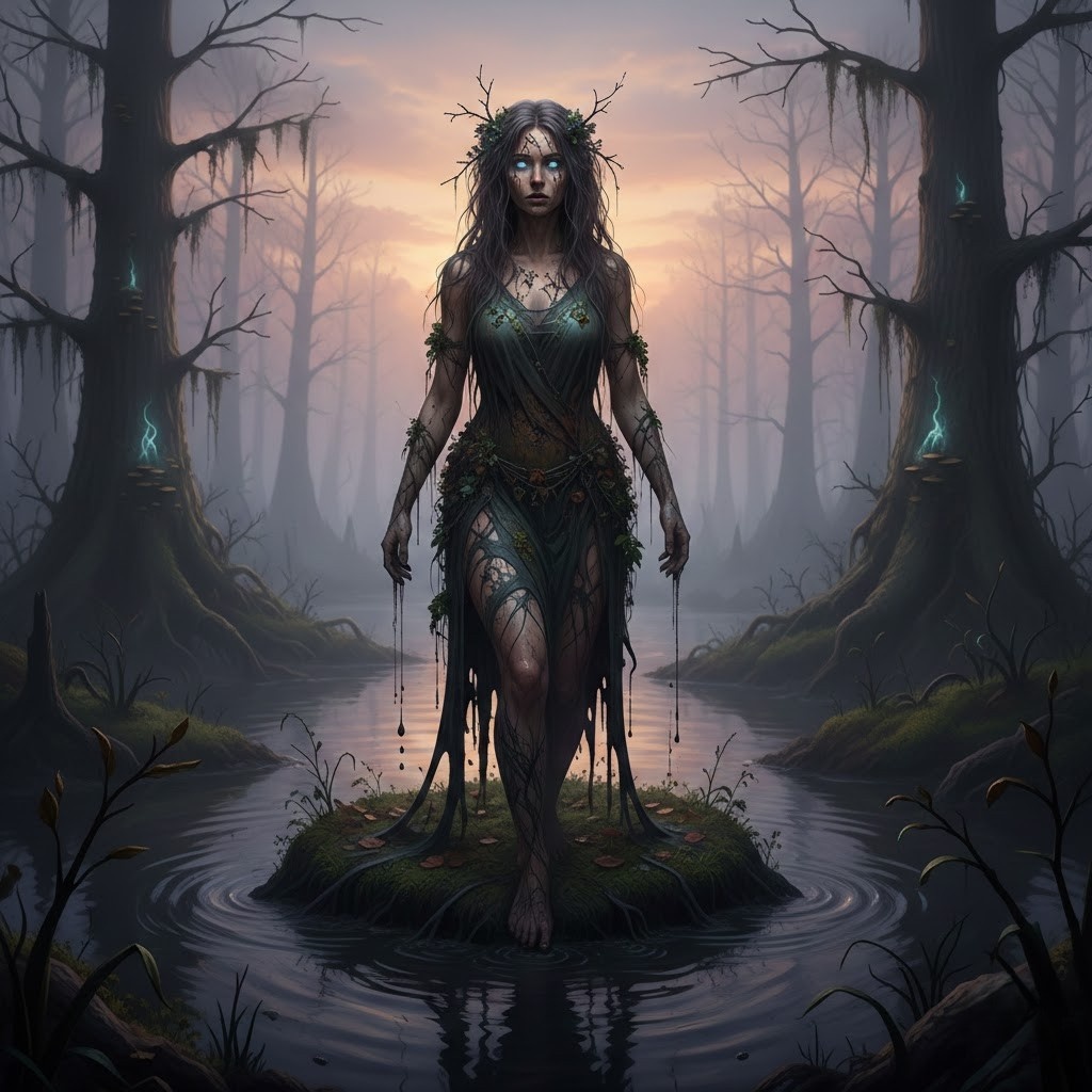 С тех пор это стало проклятием. Каждую весну и осень, когда болото особенно активно дышало туманами, Болотник — хозяин трясины — забирал самую красивую, веселую, завлекательную девушку. Забирал себе в жены, в болотную пучину.