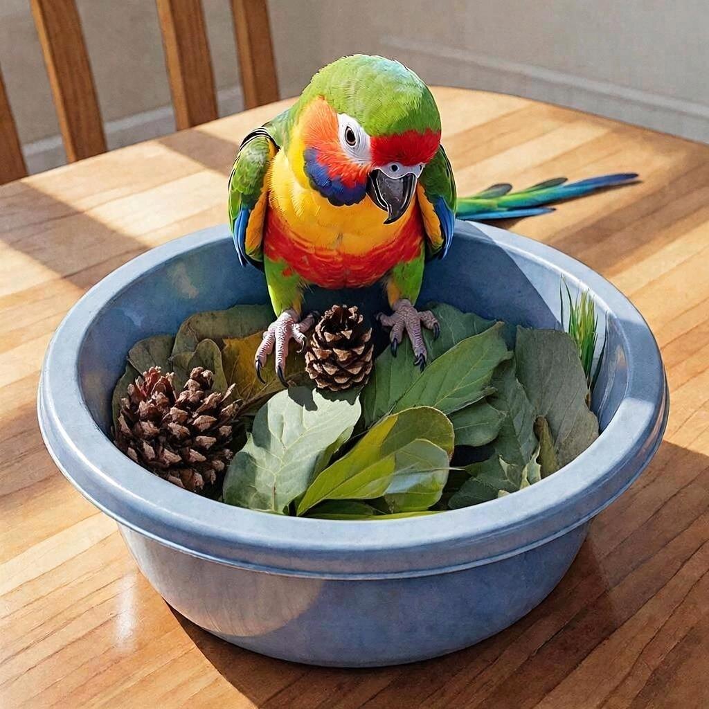 Любая емкость: старый лоток из-под клетки, пластиковая миска, картонная коробка (ее, кстати, птицы тоже с удовольствием разгрызут). Главное — чтобы бортики были достаточно высокими, иначе попугай быстро разбросает все вокруг.