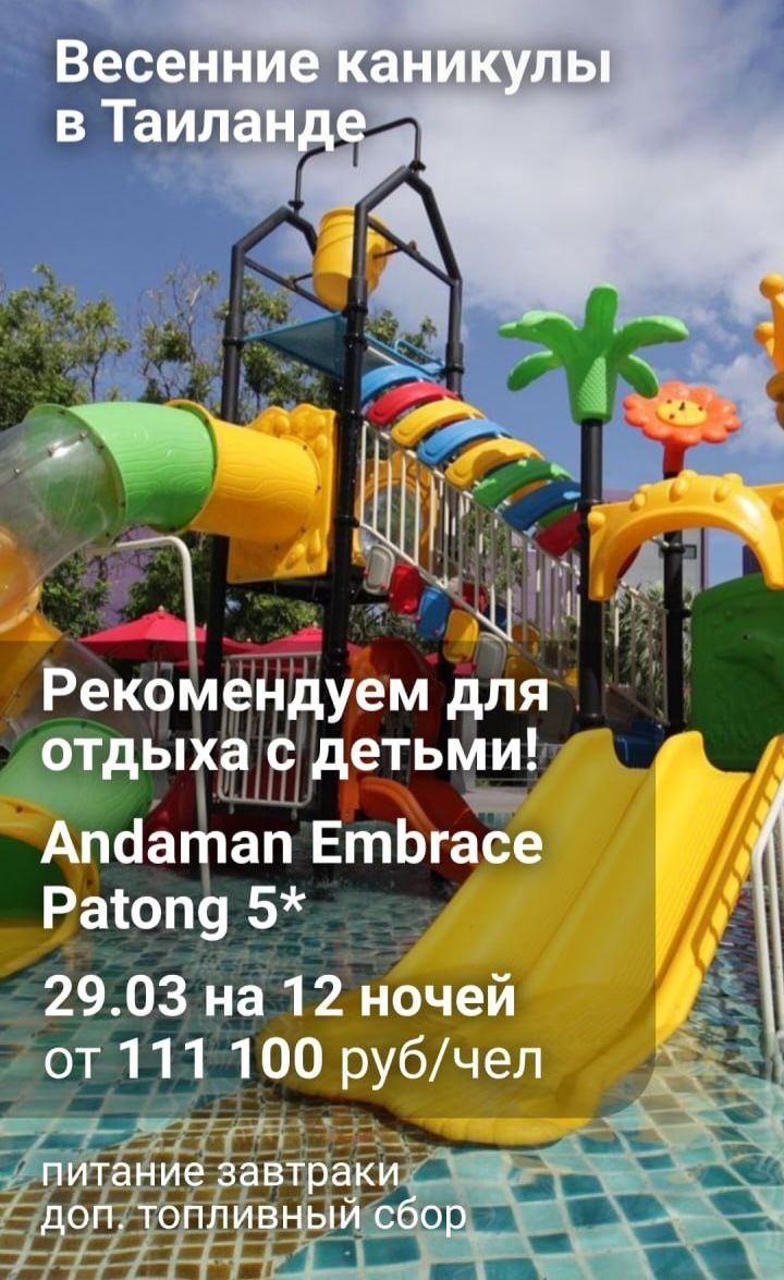 Wyndham La Vita 5* Раваи. Рядом кафе, фруктовые магазины и массажные салоны. До пляжа Найхарн есть трансфер 3 раза в день. В отеле отличные завтраки, есть водная секция для детей. Kata Sea Breeze 3* Пляж Ката в 10 минутах ходьбы. Красивая ухоженная территория, комфортные номера. Andaman Embrace Patong 5* До пляжа Патонг 5 минут, рядом вся инфраструктура. Стильные номера, хорошее питание. Для детей есть водная секция в бассейне с горками. Sugar Marina Pop Kata 4* Популярный отель для активного отдыха. Яркая территория, есть водные горки. Пляж Ката в 800 метрах от отеля. Khaolak Emerald Beach 4* Као Лак. Отель полностью после реновации. Красивая, просторная, зеленая территория. Свой пляж. Большой мини-клуб и новый аквапарк для детей! Рядом множество кафе Phuket Emerald Beach 5* 2 минуты до пляжа Карон. Разнообразное питание, стильные номера. Есть аквапарк для детей. Мы рекомендуем проверенные отели