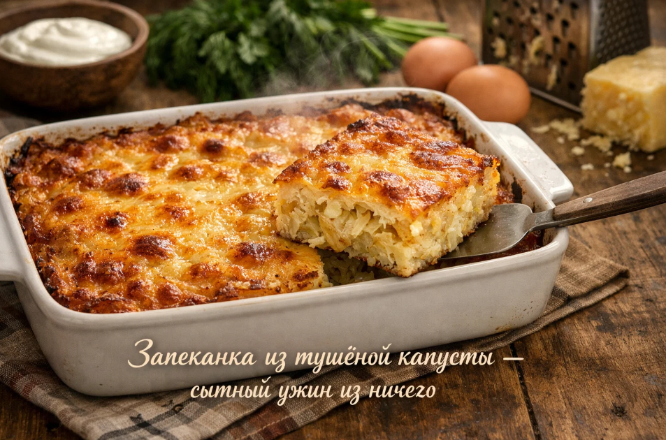 Попробуйте сами. В следующий раз, когда после обеда останется тушёная капуста, не убирайте её на дальнюю полку холодильника. Достаньте яйца, натрите сыр — и через полчаса у вас на столе будет ароматная, сытная запеканка. Сытный ужин из ничего, как я называю это блюдо. Ужин, который согреет, накормит и порадует всю семью. А что ещё нужно от домашней еды?