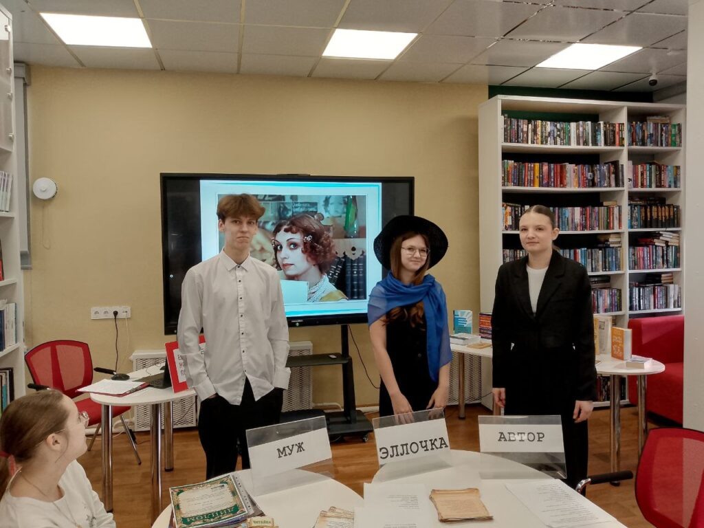 Ведущая предложила инсценировать отрывок из произведения И. Ильфа и Е. Петрова «Двенадцать стульев». Очень интересно с увлечением и азартом ребята разыграли сценку, в роли Эллочки была Анастасия Кращук, а в роли мужа – Дмитрий Комаров.