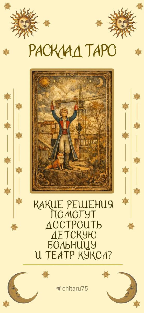 Карты Таро рассказали, что поможет достроить Театр кукол и детскую больницу. Расклад советует не просто «добивать» старые проекты, а эмоционально и организационно перезапустить их, сделав символами нового, прозрачного и успешного подхода к строительству социальных объектов в Забайкалье. Нужно не достраивать, а заново строить — с новой командой, новым духом и на всеобщем виду. Тогда успех, обозначенный картой Солнце, станет неизбежным. 🟦 Перейти в MAX