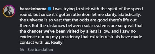 "Во время своего президентства я не видел доказательств того, что инопланетяне вступили с нами в контакт. Серьёзно!" - написал экс-президент США в соцсетях.