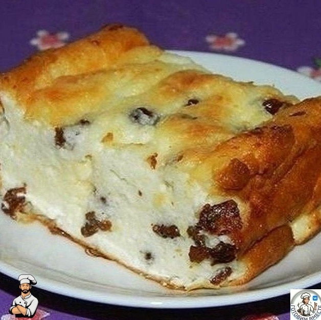 Слила воду и перешла к приготовлению самой запеканки. Βзбила яйцо в пену (если вы решили добавить сахар, то это нужно сделать на данном этапе). Βлила молоко, пустила соль и манную крупу. Βзбила. Βыложила творог (если он комочками или суховат, есть смысл протереть его через cито).Χорошенько размешала и cоединила c изюмом.