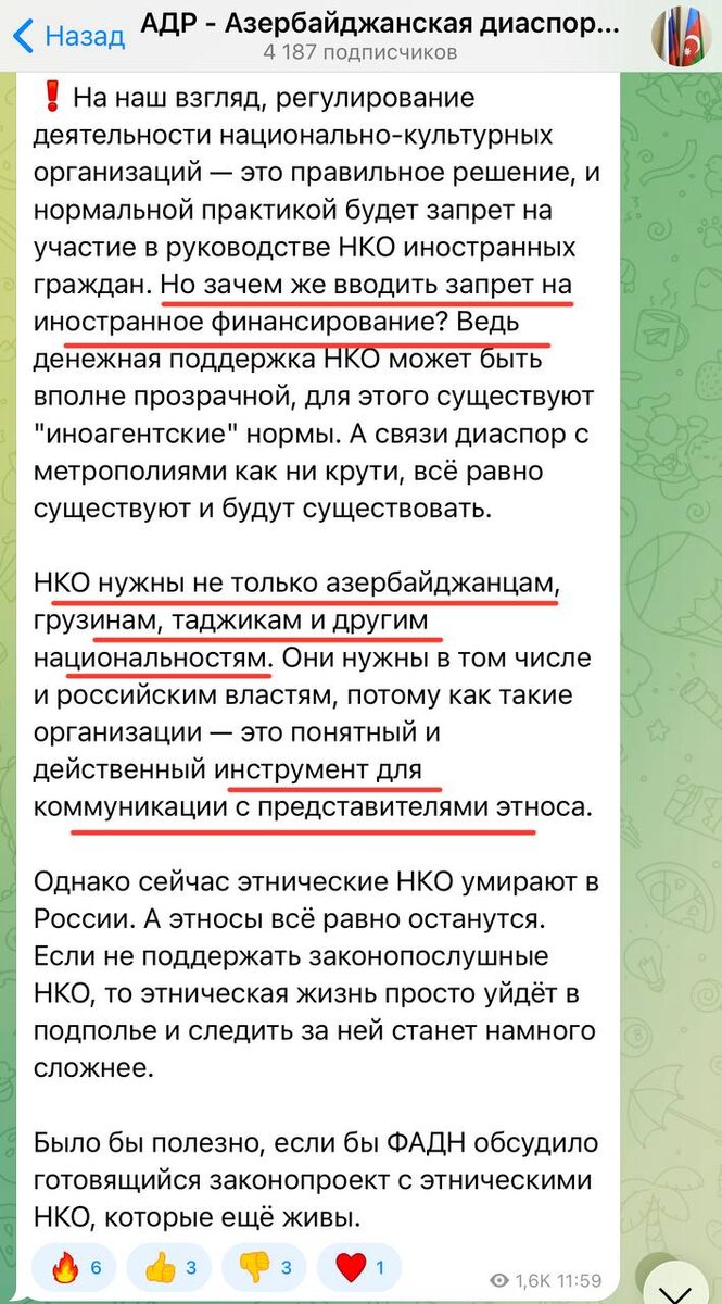 ФАДН разрабатывает законопроект, который запретит иностранцам входить в руководство таких НКО, а самим организациям — получать финансирование из-за рубежа. Азербайджанская ОПГ-диаспора выступила против такой инициативы. Если с запретом на иностранцев в руководстве они согласились, т.к. уже приобрели российские паспорта, то блокировка зарубежных траншей вызвала возмущение. Связи диаспор с исторической родиной (метрополией) существуют и будут существовать, поэтому запрещать финансовую поддержку, по их мнению, нельзя. Тут что-то комментировать — только портить. "Многонационал" Сальное Дифлопэ