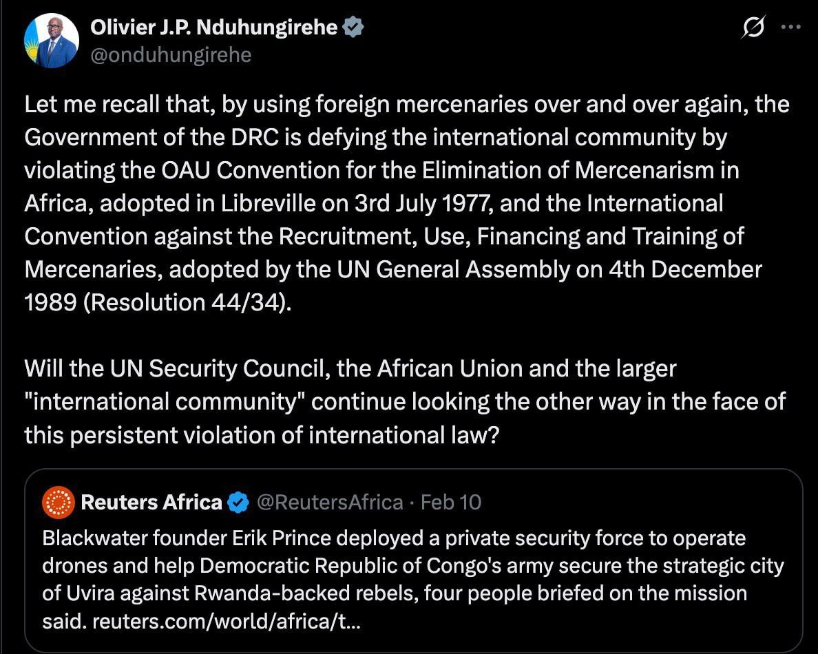 Наёмник наёмнику рознь МИД Руанды отреагировал на американские ЧВК в ДР Конго Есть ли более надежный способ защитить себя, чем использовать наёмников? Этот вопрос в Киншасе даже не обсуждается - единогласное «нет». Только не всем соседям нравится такой подход, особенно руандийцам, которые ведут прокси-войну на территории ДР Конго. Глава МИД Руанды осудил турне Эрика Принса по соседнему государству, припомнив решение предшественника Африканского союза о ликвидации наёмничества в Африке. В Кигали начали смотреть на присутствие западных сил как угрозу своих дальнейшим планам, что и побудило их пойти на приостановку конфликта на южном фронте. Все-таки условия, при которых иностранные силы, курируемые разведкой США, будут защищать рудники под их контролем отличаются от румын, которые воевали за относительно небольшие зарплаты под руководством авантюриста-оппозиционера. @rybar_africa Присоединяйтесь 👇 https://geochronic.ru 👍Хроники Геополитики👍