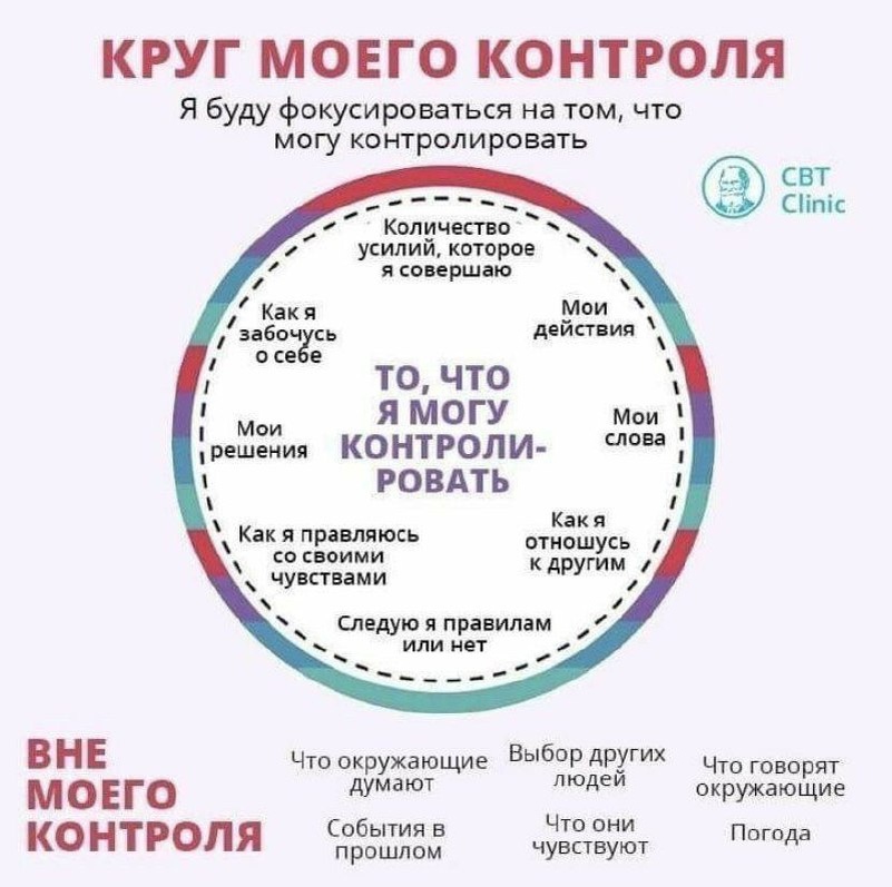 Последнее время замечаю, что работая по запросу "снизить вес/работа с пищевым поведением" я сталкиваюсь с тем, что мы с клиентами начинаем работать с тревогой. Вообще, 99% случаев в моей практике- это не только про еду. Практически всегда за едой стоят какие-то сложные эмоции, которые человеку сложно переживать. Тревога. Сейчас такое время, что, я думаю, каждый из нас испытывает ее на себе и это мешает нам жить полноценную жизнь. Постоянная тревога отнимает у нас очень много ресурсов. 💔Поэтому, первое, что я бы порекомендовала вам сделать, это начать оценивать вещи, на которые мы можем повлиять и те, которые не поддаются нашему контролю (см.рисунок). Не все в этом мире поддается нашему контролю. Но наш мозг не всегда это понимает и начинает тревожится. 💔Отметив для себя свой локус контроля, ваша задача начать стараться концентрироваться на своем "микро-мире": какие действия вы можете совершать, какие решения будете принимать, как будете заботиться о себе и других и т.д. Чтобы
