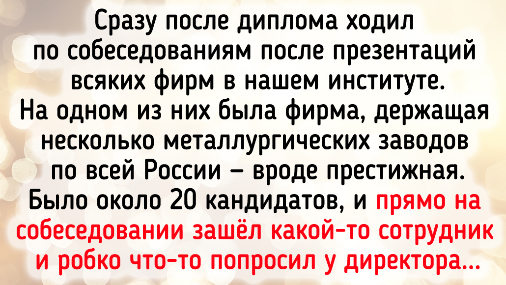 Было около 20 кандидатов, и прямо на собеседовании зашёл какой-то сотрудник и робко что-то попросил у директора. Тот его покрыл трёхэтажным матом.