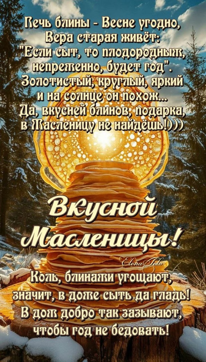 Утром свекор со свекровью отправляли невестку на день к отцу и матери, а вечером сами шли в гости к сватам. Договаривались о времени и месте гуляний. Заканчивали строить снежные города, качели, балаганы. В понедельник начинали печь блины. Первый блин дарили бедным соседям, чтобы те помянули усопших. Друзья, вкусной и тёплой Масленицы. Мира и добра. Душевного равновесия и любви, хорошей погоды и солнышка. У нас идёт ливень. А какая погода у ☔ вас?