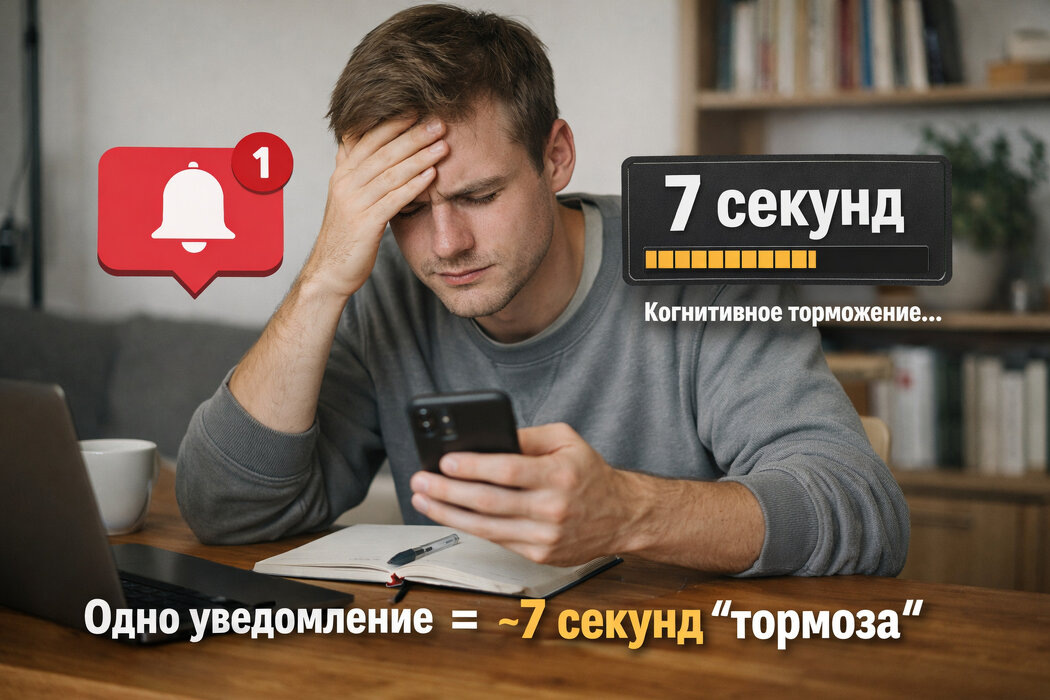 Отвлекаюсь на 7 секунд - когда приходят уведомления. Откуда взялась эта цифра? Исследователи из Computers in Human Behavior измерили этот момент в условиях, максимально близких к реальной жизни — когда человек работает с телефоном, как обычно. Они следили за скоростью реакций, за точностью ответов и за зрачками. Результат простой: после уведомления мозг тормозит примерно на семь секунд. Представьте, что вы идете по улице. Вдруг сзади сигнал машины. Вы не оборачиваетесь полностью. Но на долю секунды внимание уходит туда. Вы оцениваете: опасно ли? касается ли меня? С уведомлением то же самое: мозг запускает процесс оценки. Насколько это важно? Нужно ли реагировать? А вдруг что-то срочное? Эта оценка стоит вам когнитивных ресурсов: пока вы её проводите, всё остальное обрабатывается медленнее. Авторы исследования назвали это транзиторным замедлением когнитивной обработки. Проще говоря — мозг притормаживает. Зрачки в этот момент реагируют точно так же, как при активном переключении внимания