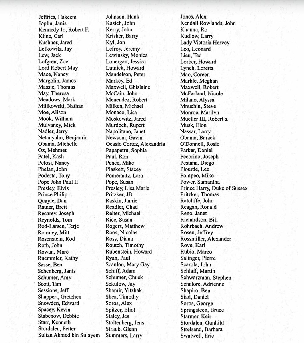 «Некоторые из упомянутых имен имели «обширный прямой контакт по электронной почте с Эпштейном или Максвелл», в то время как другие были упомянуты в части документа, которая на самом деле не связана с делами Эпштейна и Максвелл», — уточнила Бонди в письме в Судебный комитет Сената. В опубликованном перечне присутствуют Билл и Хилари Клинтон, Барак и Мишель Обама, Камала Харрис, Джо Байден, принц Гарри, Билл Гейтс, Вуди Аллен, Марк Цукерберг, Боно, Роберт Де Ниро, Ким Кардашьян, Jay-Z и Бейонсе. Подпишись на "Новый Взгляд"