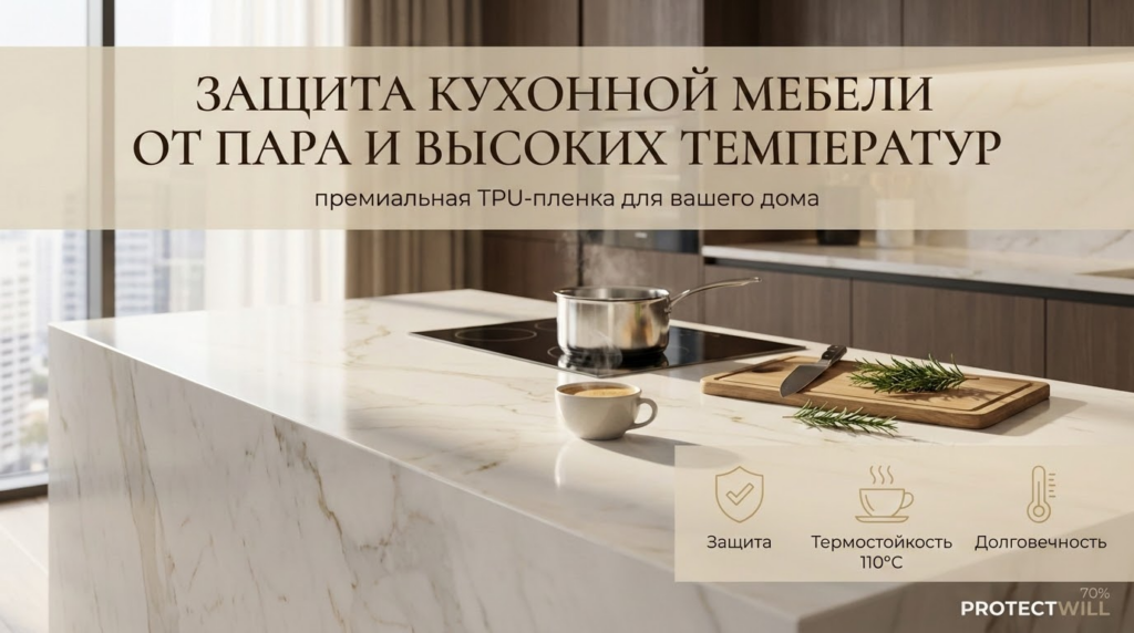Технический факт: большинство современных кухонь покрыты полиуретановыми или акриловыми лаками. При нагреве свыше 70-80°C они размягчаются. Если в этот момент коснуться поверхности чем-то твердым, останется вмятина. Если капнуть вином — пигмент въестся намертво. Термополиуретановая пленка (TPU) работает как демпфер. Она принимает тепловую энергию и рассеивает её, не давая добраться до чувствительного лака или пор камня.