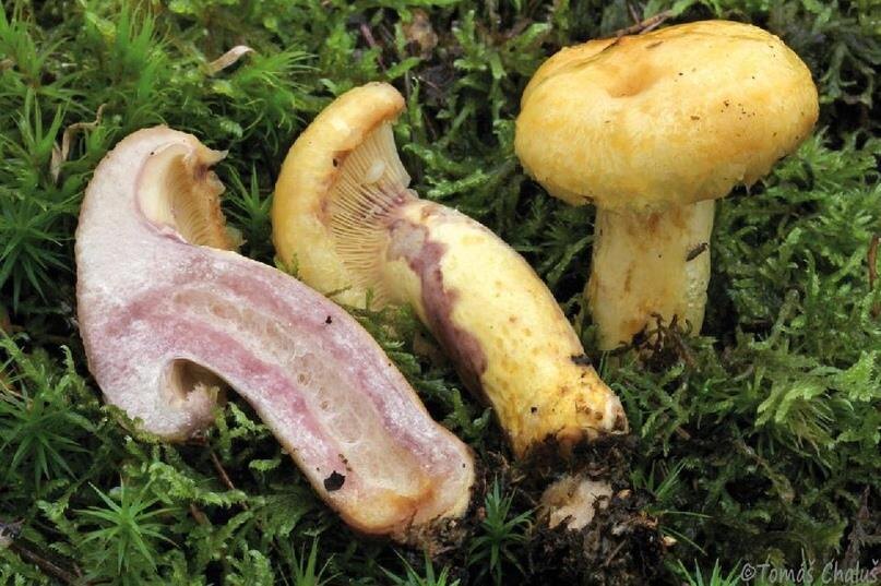 Внешне гриб довольно приметен: шляпка диаметром 6–16 см, в центре воронковидно‑вдавленная, влажная, клейкая, волокнисто‑чешуйчатая, с мохнатым подвернутым краем и неясно выраженной концентрической зональностью; окраска — жёлтая, при надавливании лиловеет. Ножка высотой 5–10 см и диаметром 1,5–3 см, часто суженная к основанию, во влажную погоду слизисто‑клейкая, внутри рыхлая, со временем становится полой. Главная отличительная черта — белый млечный сок, который на воздухе быстро приобретает лиловый оттенок. Пластинки низбегающие, вильчато разветвлённые, узкие и частые, бледно‑жёлтые, тоже лиловеют при надавливании. Мякоть желтовато‑белая, споровый порошок — жёлтый. Плодовые тела появляются в августе–сентябре.