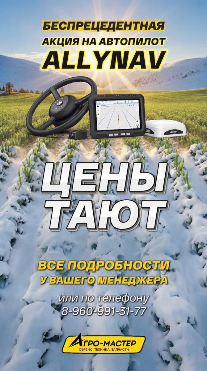 ! 👋 ☀️ Солнце светит ярче, ❄️ снег тает, а наши цены 💸 на AllyNav уже растаяли. ‼️ Мы объявляем беспрецедентную акцию на автопилоты AF305. ✔️ В период с 15 февраля по 15 марта мы снижаем наши цены чтобы вы подготовились к сезону. ‼️ Срочно звоните 📞 вашему менеджеру или пишите в комментарии под этим постом. 🚜 Начните сезон с новым автопилотом Allynav AF305.