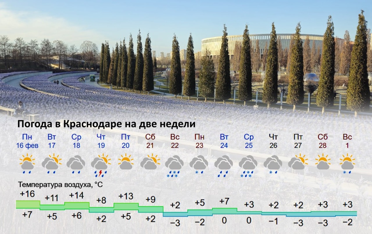 ☁️ Прогноз погоды в Краснодаре на две недели с 16 февраля по 1 марта