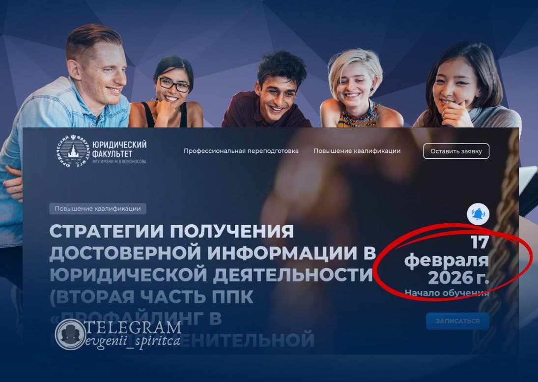 17 февраля на юридическом факультете МГУ имени М.В. Ломоносова стартует 1-я часть курса повышения квалификации «Профайлинг: модели получения признания». В чем принципиальное отличие этой программы? ✔️ Научная легитимизация. В то время как рынок переполнен «экспертами по чтению лиц», программа МГУ выводит профайлинг в статус строгой междисциплинарной дисциплины. Все методики верификации показаний и анализа невербального поведения опираются на эмпирическую валидацию и международные стандарты судебной психологии. ✔️ Синтез теории и поля. Преподавательский состав объединяет глубокую академическую школу (канд. психол. наук Н.В. Дьякова) и колоссальный практический опыт в детекции лжи (Евгений Спирица). Это позволяет слушателям получить инструментарий, который работает не только в теории, но и в реальной следственной практике. ✔️ Методология Blended Learning. Обучение построено по принципу «перевернутого класса»: теоретический блок на дистанционной платформе сочетается с очной полевой пр