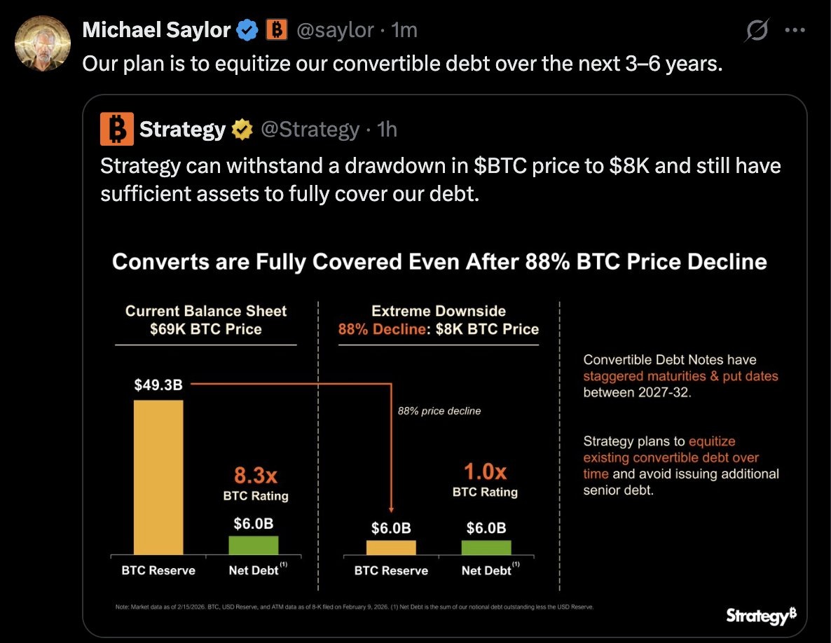 🔸Strategy заявляет, что способна пережить обвал биткоина до $8000 и при этом сохранить достаточно активов для полного покрытия своих