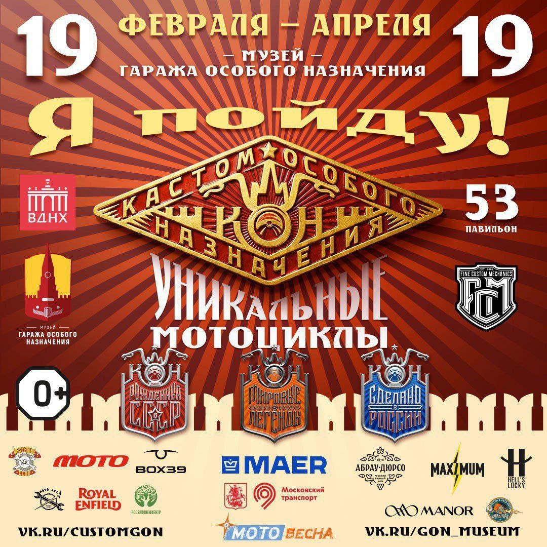 Одно из самых ожидаемых событий года уже совсем скоро! С 19 февраля по 19 апреля 2026 года под крышей нашего музея соберутся лучшие кастомы мира. Вы увидите уникальные мотоциклы: переосмысленные модели эпохи СССР, современные российские разработки и знаковые мировые образцы. Каждый мотоцикл имеет свою историю и демонстрирует индивидуальный подход к кастомизации — от технических до эстетических решений. Оцените работу мастеров и выберите своего фаворита. 💣А ещё обязательно посетите экспозицию «Мотолегенды», в которой расположились уникальнык образцы конца XIX века до передовых разработок современности. Не пропустите особое событие — финал 19 апреля: грандиозное закрытие выставки, награждение участников и подведение итогов зрительского голосования! ⏰️Время проведения: 19 февраля — 19 апреля 2026 года. 💣Где: Музей Гаража особого назначения, ВДНХ, павильон 53. Купить билеты со скидкой 15 % до 19.02.26 по ссылке. *Билет включает посещение сразу трёх экспозиций: — «Кастом особог